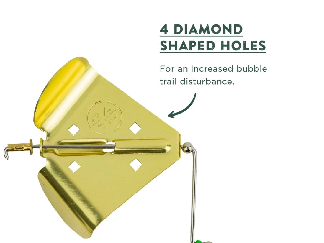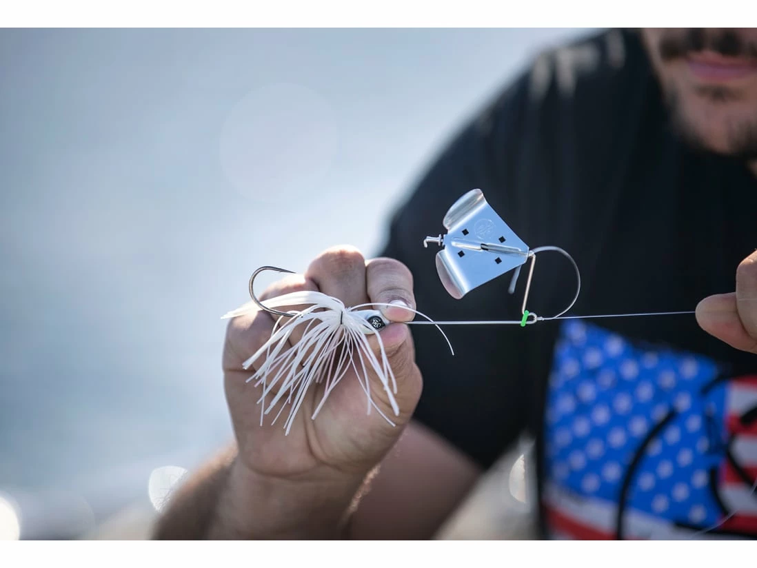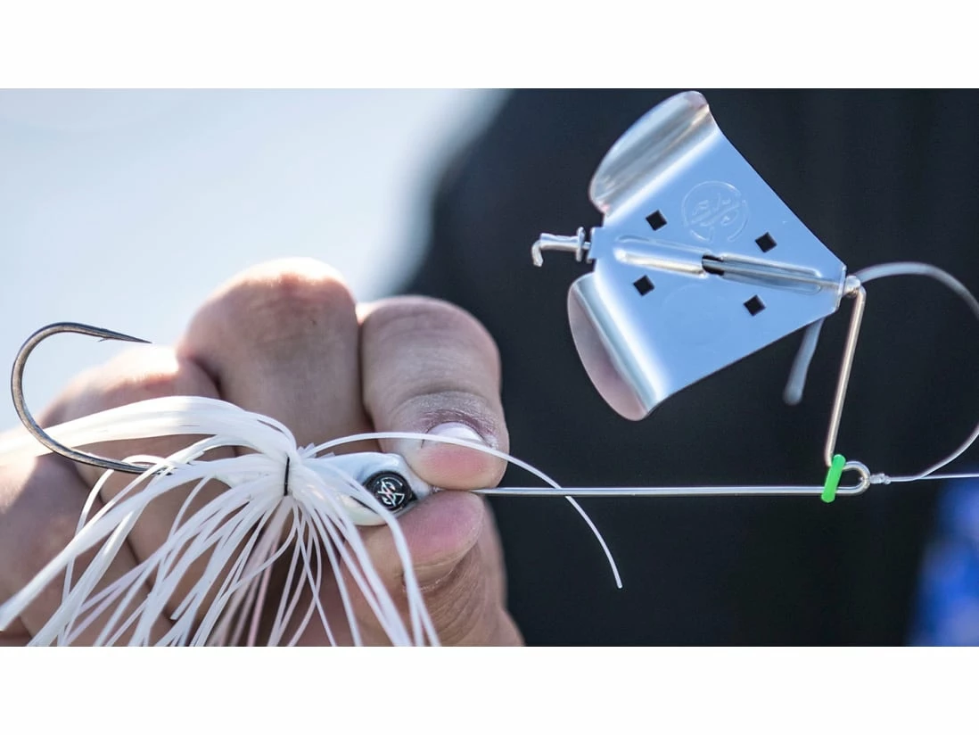 The Googan Squad Hummer has slotted holes stamped into each blade for an increased surface disturbance. A hand-tied rubber skirt is clinched around an ultra-sharp Mustad hook adding to the Hummer’s liveliness. And finally, to help prevent dreaded line slippage, each Googan Squad Hummer is topped off with a rubber band line keeper.