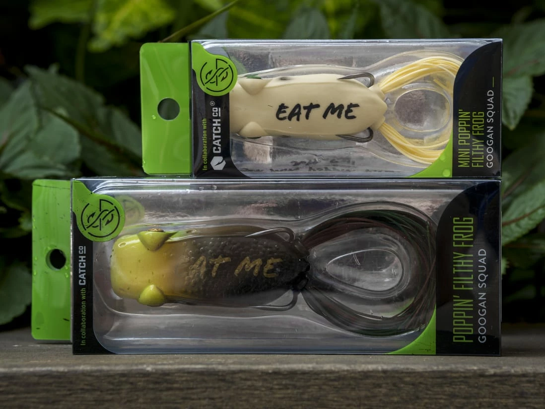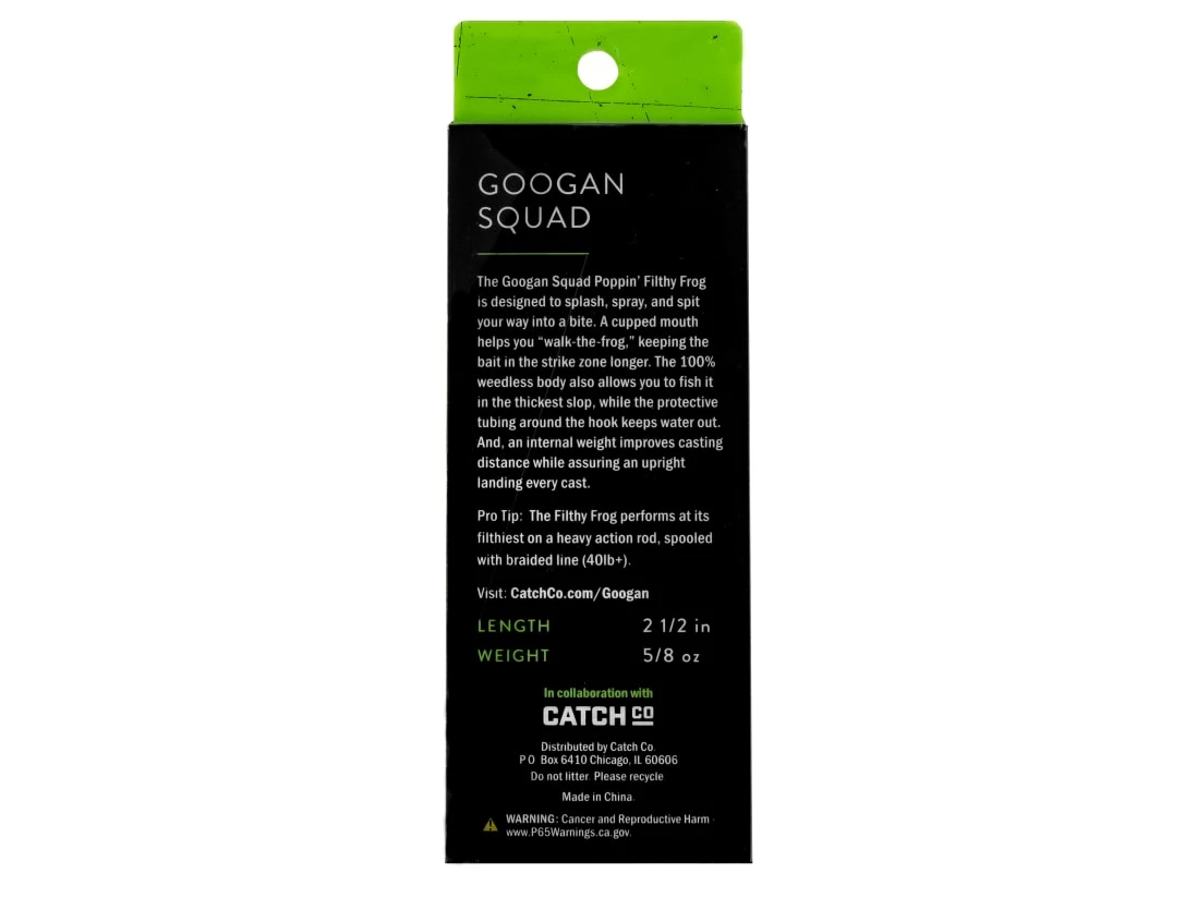 The Googan Squad Poppin’ Filthy Frog is designed to splash, spray and spit your way into a bite. The 100% weedless body also allows you to fish it in the thickest slop, while the protective tubing around the hook keeps water out. And, an internal weight improves casting distance while assuring upright landing every cast.