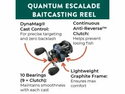 The Escalade Baitcasting Reel from Quantum combines advanced technologies to deliver unparalleled angling performance. It features a lightweight graphite frame, a machined aluminum skeletal spool, and a solid, 10-bearing system supporting a powerful, fine-tuned gear set. Quantum’s proven magnetic cast control ensures precise targeting and zero backlash. The reel’s continuous anti-reverse clutch enables head-turning hooksets that stop lunkers on a dime, and the tenacious drag applies smooth resistance until the fight is over. The Quantum Escalade Baitcasting Reel is expertly engineered to provide incredible performance on the water—add this reel to your tackle arsenal now! • A premium baitcaster from a trusted, innovative manufacturer • Fine-tuned gearing provides smooth cranking and winch-like power • Lightweight graphite frame and a shape that perfectly fits your palm • Strong, reliable drag system lets you control big fish with confidence • Ergonomic aluminum handle with chunky, no-slip paddle knobs